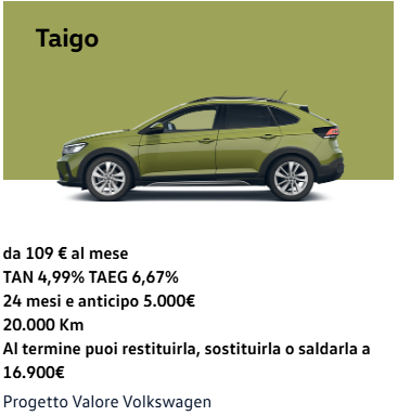 e ottenere la tua rata personalizzata e al termine del programma potrai decidere se tenere l’auto, pagando il Valore Futuro Garantito residuo, restituirla o sostituirla con un’altra Volkswagen.