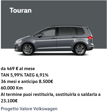 Se lo desideri è inoltre possibile includere servizi aggiuntivi come la manutenzione ordinaria o una copertura assicurativa. Al termine della scadenza programmata potrai decidere se tenere l’auto pagando il Valore Futuro Garantito residuo, restituirla o sostituirla con una nuova Volkswagen, continuando a beneficiare dei vantaggi di “Progetto Valore Volkswagen”.